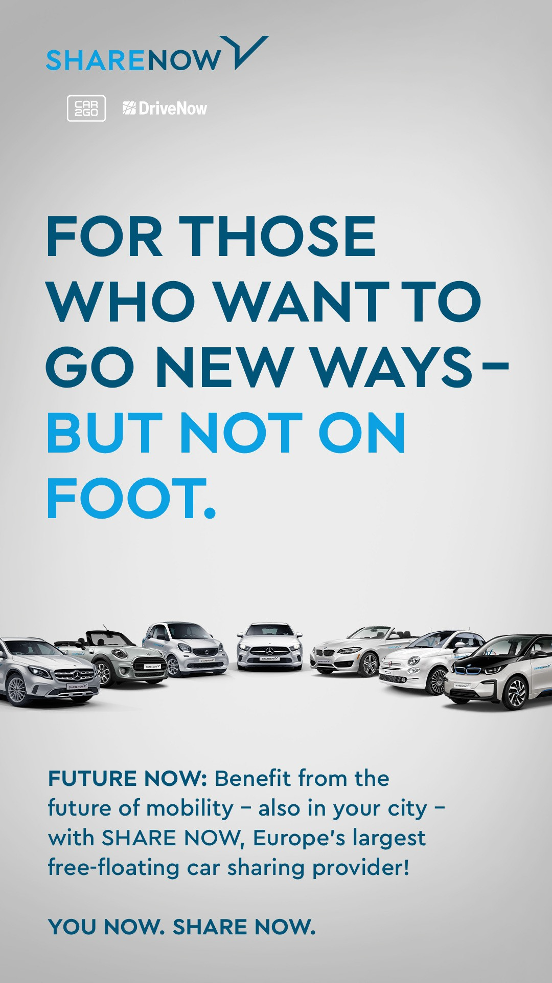 As market leader and pioneer of free-floating car sharing, SHARE NOW is represented in 16 major European cities with around 11,000 vehicles, including 2,900 electric vehicles. Around three million customers already use the service. SHARE NOW offers a sustainable solution for urban mobility and makes a significant contribution to reducing traffic congestion in cities. Each car sharing car replaces up to twenty private cars in urban traffic. SHARE NOW operates purely electric fleets in four locations and is with a total of four partially electric cities Europe's largest provider of electric free-floating car sharing. The fleet portfolio consists of vehicles of the brands BMW, Fiat, Mercedes-Benz, MINI and smart. The company is one of five mobility services that emerged in 2019 from the joint venture between the BMW Group and Daimler AG. The company is based in Berlin.